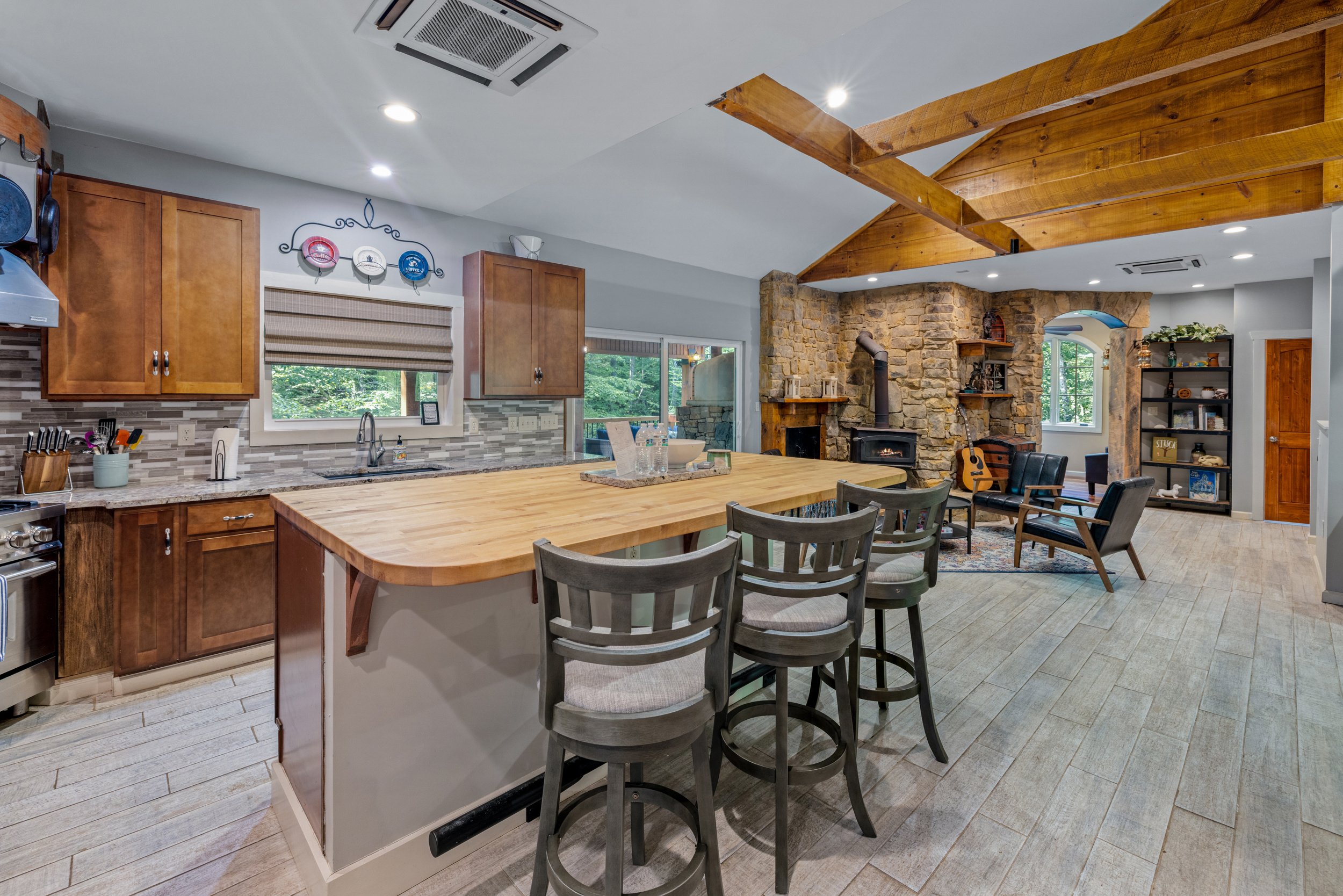 Full kitchen and living area on main level.Fully stocked kitchen and propane grill outside.