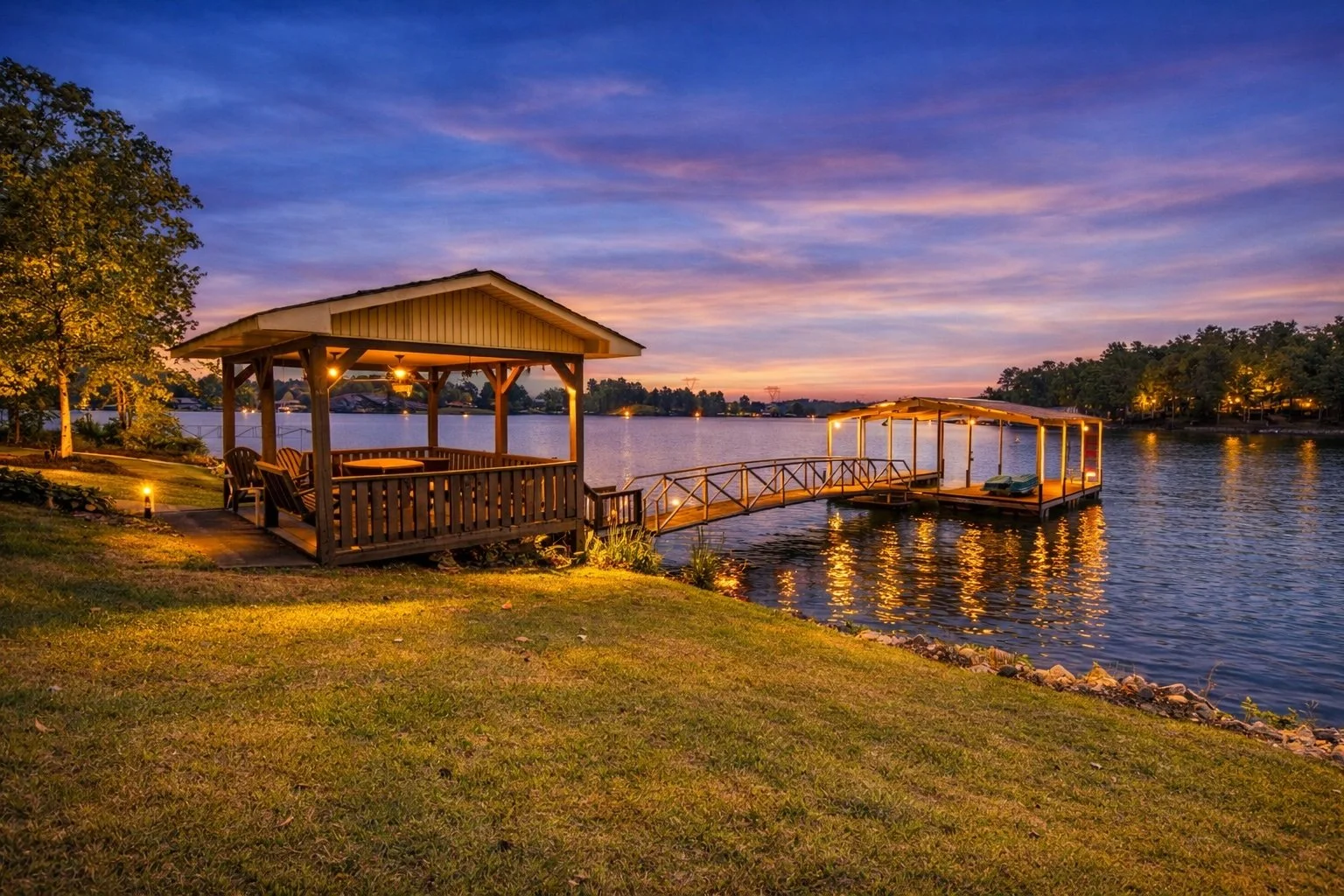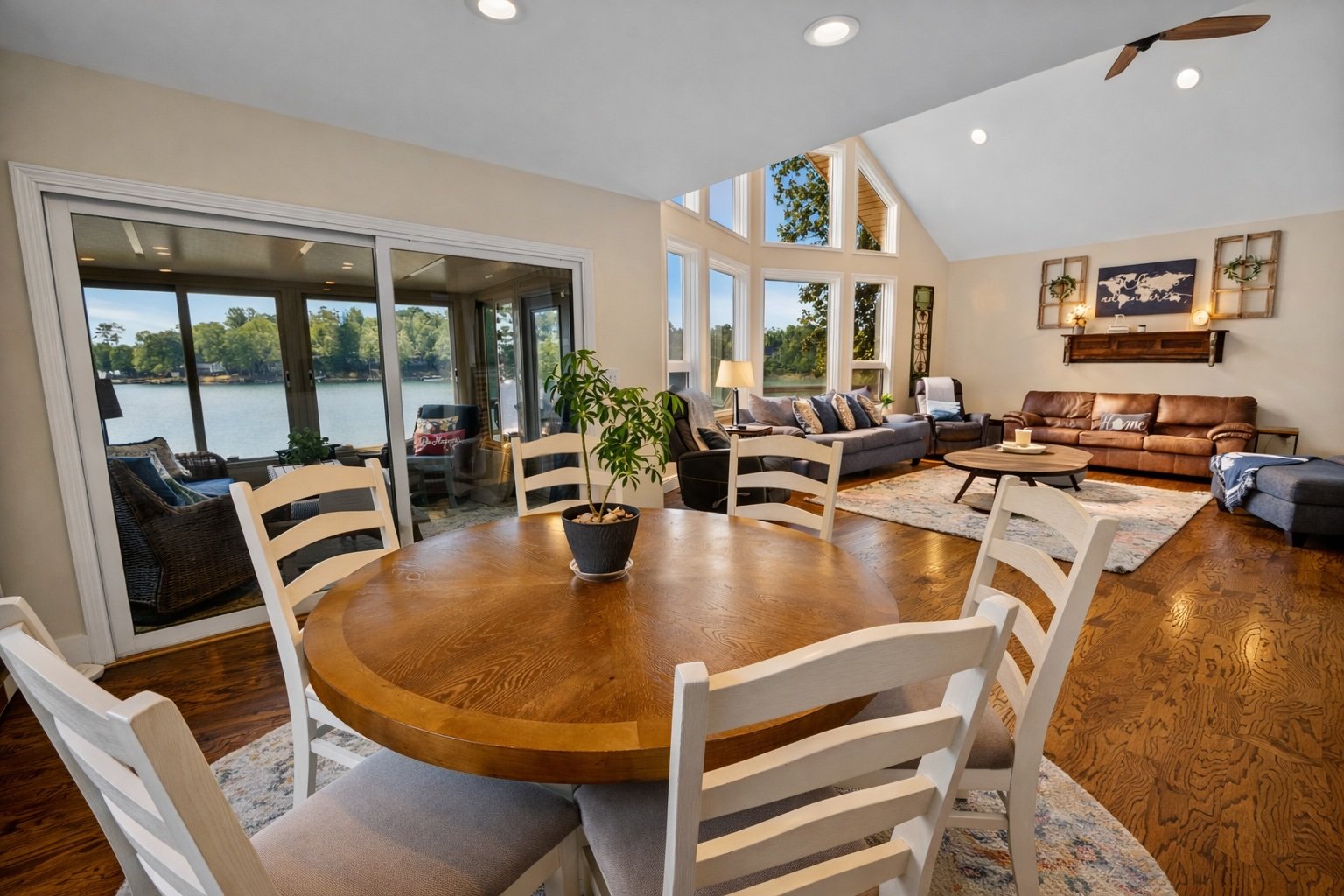 The Lake Keowee Retreat is an open concept home on nearly an acre of property with a private boat ramp for your boat or jet skis. The rental includes access to the dock with slip, boat ramp, lakeside gazebo, a four-seasons room, 2 spacious bedrooms on the first floor and loft area with 4 single beds.