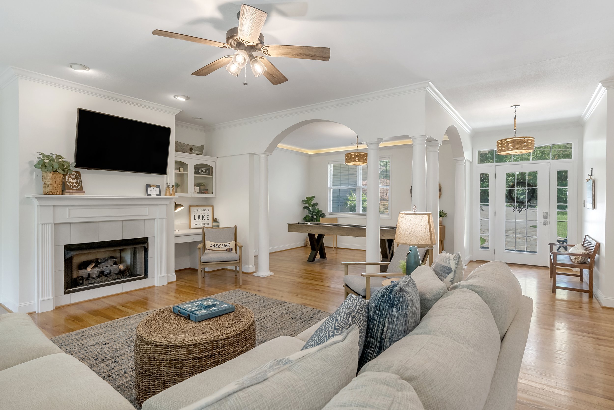 Full kitchen and living area on main level. Fully stocked kitchen and grill outside. Shuffleboard table perfect for family games. Outdoor patio overlooking large back yard and lake access.