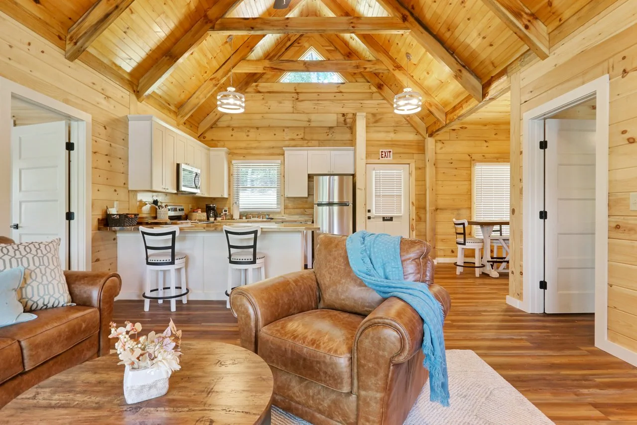 As you step inside, you'll immediately feel at ease in the peaceful ambiance of our chalet. The open-concept living area is tastefully decorated, providing a comfortable space to unwind after a day of fishing and swimming. Relax on the plush leather sofa, or gather with loved ones for quality time and laughter around the kitchen island bar top.